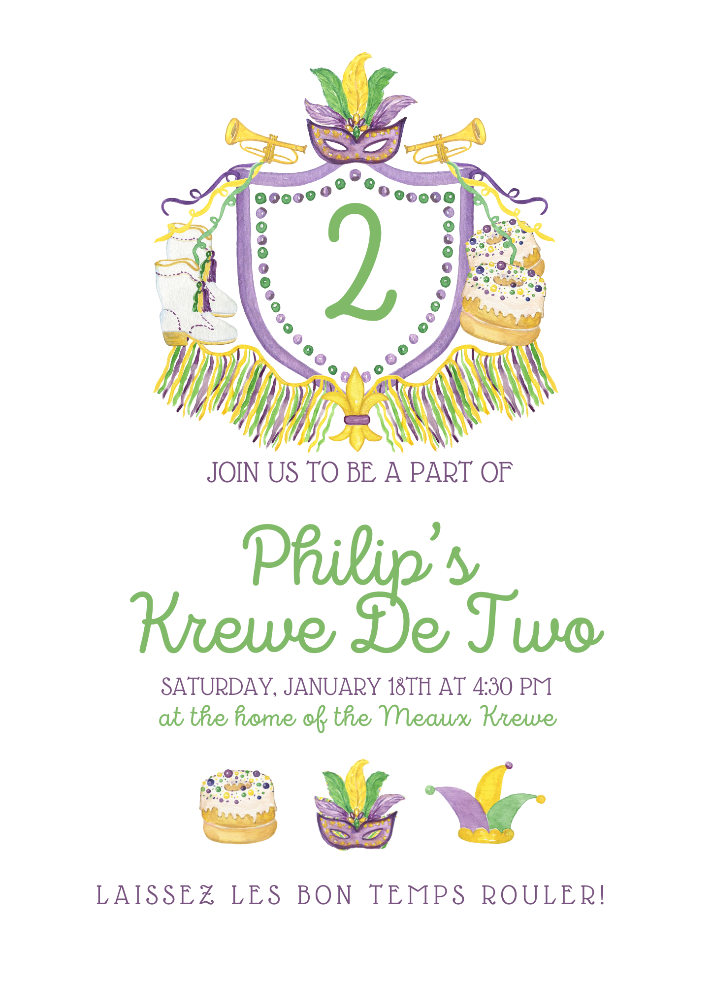 5x7 Invitation on beautiful 110lb bright white stock make the first impression of our party, one they won't forget! These fun Mardi Gras themed invitations are perfect for krewe events, King Cake parties, parade watch parties, birthdays, and so much more!