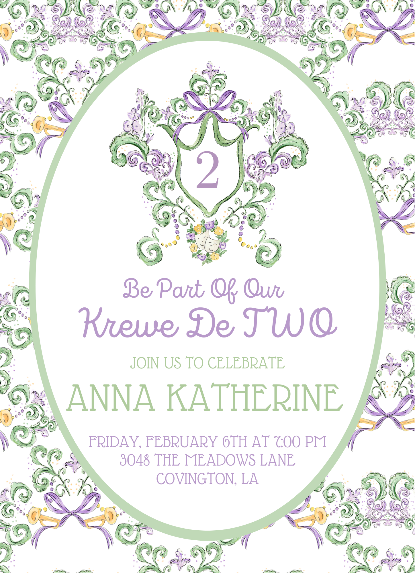 5x7 Invitation on beautiful 110lb bright white stock make the first impression of our party, one they won't forget! These fun Mardi Gras themed invitations are perfect for krewe events, King Cake parties, parade watch parties, birthdays, and so much more!